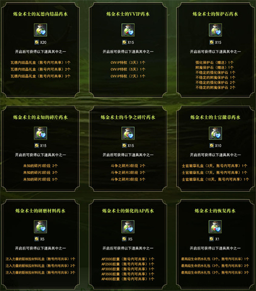 在12月2日维护后至12月16日维护前,英雄们完成特殊战役、王城黄玉厅至丰饶之森战役、骑士团战役、敢死队战役、时空扭曲战役,即可获得“炼金术士的硬币”,使用硬币可在兑换商店兑换到炼金术士的瓦德内结晶药水、炼金术士的VVIP药水、炼金术士的未知的碎片药水等,开启后有机会获得更多实用道具哦!