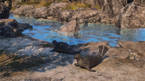 海岸线上分布着海豹、海鸥等新动物,它们在潮线与礁石之间形成独特的生态。向内陆行进浓密的林地与起伏的丘陵构建出另一套截然不同的生态链,狐狸与山羊在此出现,为玩家带来新的狩猎和收集素材。